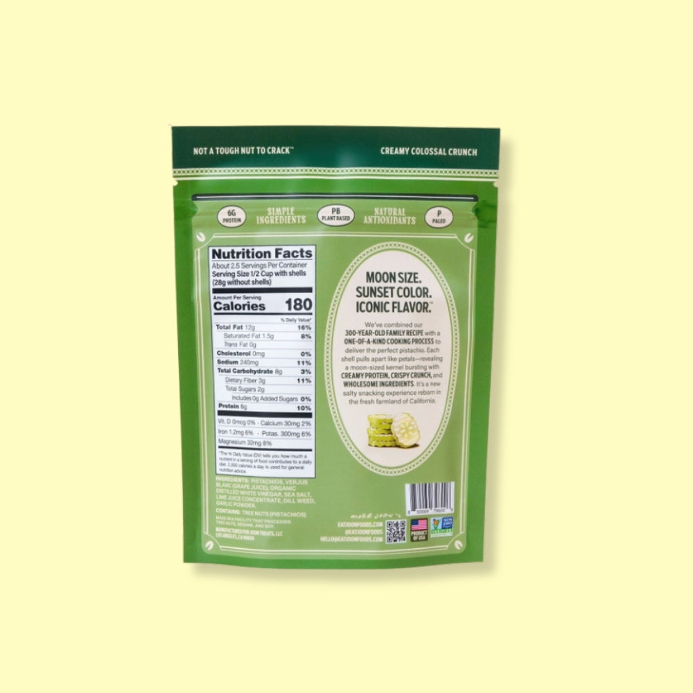 Bold and zesty, perfect for those who universally enjoy a tangy twist that tickles the taste buds. - 4.5oz Resealable Bag. These pistachios are rooted in a 300-year-old family recipe. Honoring tradition, we use a light-touch cooking process that deeply infuses flavor and creates a uniquely creamy, colossal crunch.