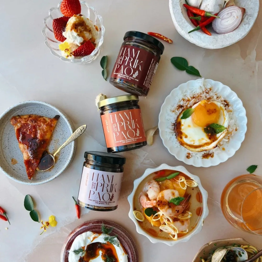 This Nam Prik Pao is different than your typical chili crisp or crunch, chiefly due to it being an actual jam, featuring real palm sugar and tamarind. It's delicious and balanced with tangy tamarind and smoky notes of dry roasted chilis. With a base of fresh caramelized shallots and garlic, this is a perfect accoutrement to zhuzh up spreads, dips, stir-fries, and pasta. It's just as lovely straight-up on pizza, eggs, and our favorite - charcuterie boards!