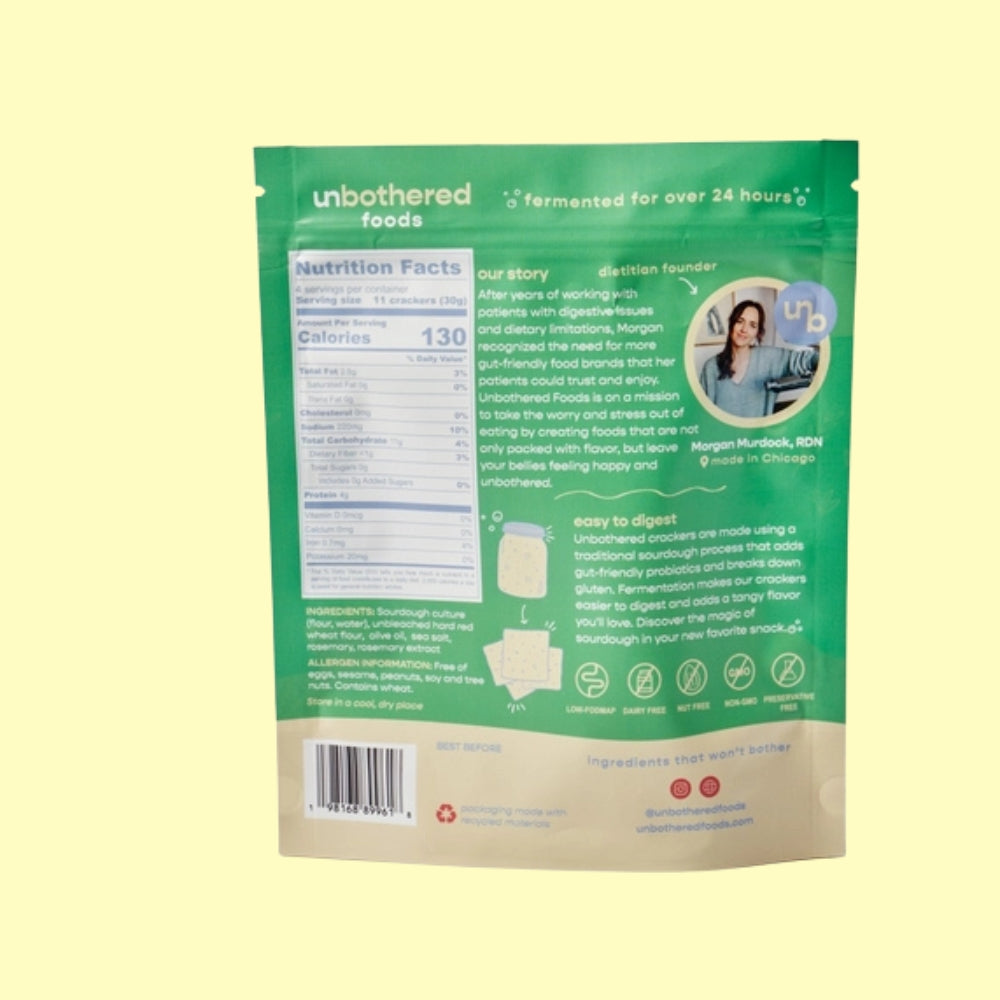 Unbothered Foods sourdough crackers are crafted with a traditional sourdough stater and fermented for 24 hours to enhance flavor and digestibility. This fermentation process breaks down gluten and introduces friendly gut-probiotics, delivering a tangy, savory bite reminiscent of fresh sourdough bread.